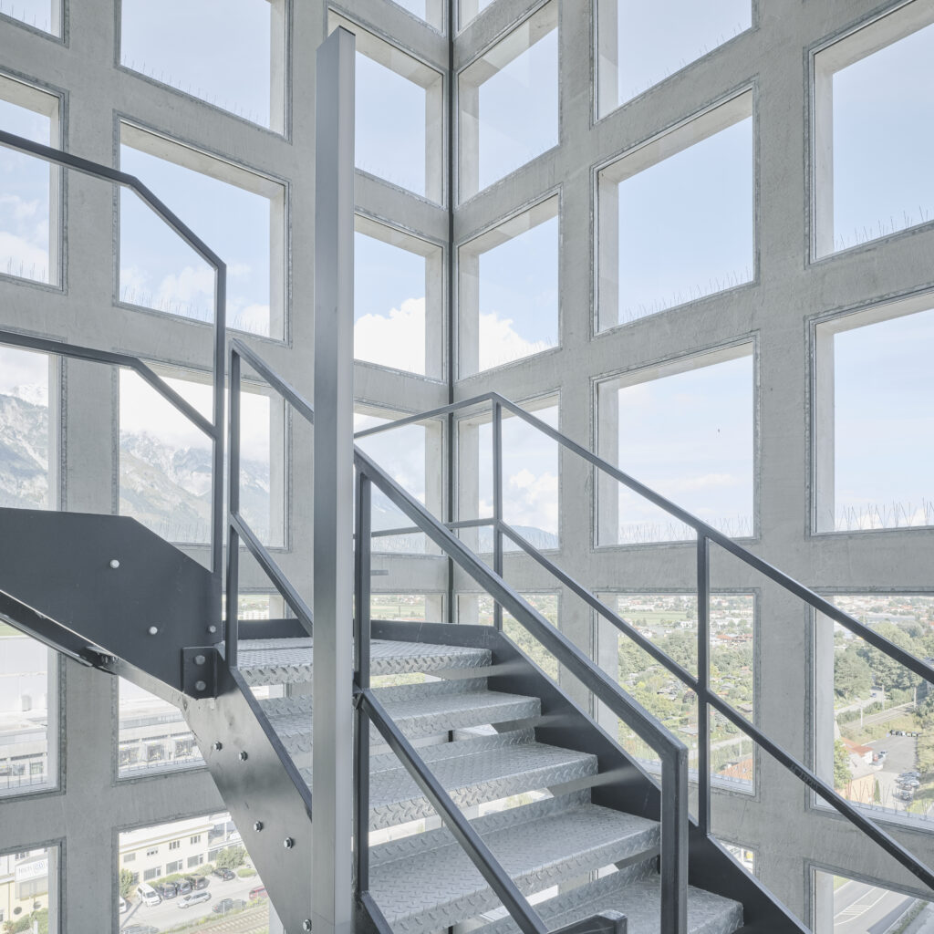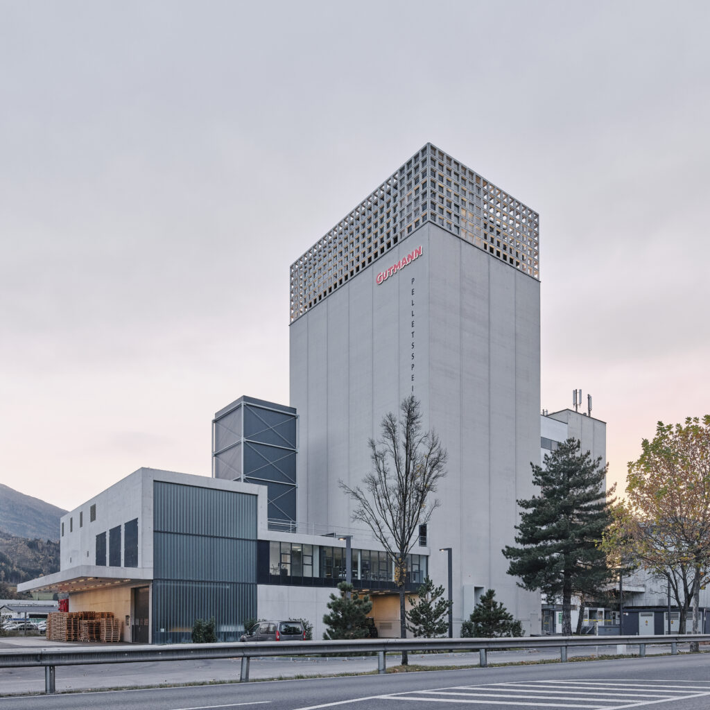 Das Obergeschoss selbst setzt dem neuen Gutmann Pelletsspeicher wahrlich die Krone auf und erweitert den Turm um aufsehenerregende Besprechungs- und Tagungsräume, die in Sichtbeton und Glasbauweise realisiert wurden und mit einem imposanten 360°-Grad-Panoramablick über das ganze Inntal beeindrucken.